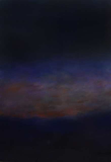 円に内接する三角形を想像してみる。その三角形が徐々に膨張する。接点を突いて頂点がはみ出る。七里知子の絵はそんな円と内接する三角形だった。円は「美しい」。三角は「なじみのないもの」である。病の時の前後を経てあらわれてきた新作ではこの円を三角形の頂点が貫き、穴を開けている。美しい絵にその穴から外が、えもしれない底なし沼が覗き、目が無限定の虚空へ投げだされる。沼、虚空は絵を暗くするが、この暗さは七里の絵の美しさを照らすバックライトだ。(企画者:大倉宏)