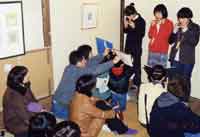 新潟絵屋は、絵をかざる空間です。いつもいつも、人々の心をひきつける、すてきな絵がかざられています。 (写真:2002年12月28日、絵屋休廊中のライブ) |