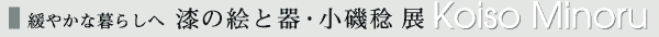 | 少ないけれど、私の家にも漆器がある。漆器店だった家から譲ってもらった小鉢、机など。ふれるといつも、時が瞬間、速度をゆるめるみたい。 小磯さんの仕事場でその秘密を垣間見た。塗りと乾燥を丹念に繰り返して作られる漆器は、それ自体が緩やかで深々とした時間の、透明な堆積物なのだ。 漆の研究者でもある小磯さんの作る器や絵は、この漆器本来の緩やかさの純度が、とても高いように感じる。けっして急や、鋭さに向かって走り出さない、坦々とした漆的リズムの水音から、形や色やデザインが汲み出されているからだろう。 やわらかい重さに引き留められ、目をふれ続けると、見る側のなかで時間が折り直され、ゆったり流れはじめる。 もっと遅く、遅くと、耳元で暖かい風がささやくよう。(大倉 宏) |
