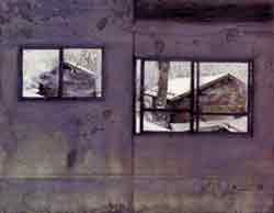 | 斎藤順正さんは、冬の絵がいい。 巻町のアトリエに最初に訪ねて絵を見た時、そう思った。斎藤さんは春も夏も秋も、静物も人も猫も描く。素晴らしいソムリエのように、絵を味わう人にいきとどいた心遣いのできる、プロフェッショナルな画家だ。 冬の絵には、でもそのソムリエが、誰もいない部屋でグラスに注ぐワインの香りがある。 雪を、窓のへり、小屋の樋にうっすらと、深々と積もった雪を見る。風が埃のように雪片を掃いていく。一瞬、冷え枯れたけやきの小枝のように細まっていく心。ひとりでいることの寒さ、つらさを、その芯をつきあげてくる弱音のよろこび。 斎藤さんに、冬の始まりから終わりまで、描いて下さいとお願いした。(大倉 宏) |
