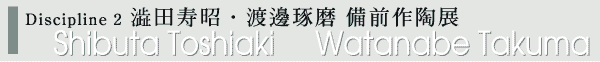澁田寿昭(しぶた としあき) ■1957年兵庫県生まれ。81年武蔵野美術大学卒業。85年備前陶苑入社。89・90・91年一水会陶芸展入選、93年日本陶芸展入選、91・97年焼締め陶公募展入選、93・94・95年陶芸ビエンナーレ入選、91・92年田部美術館茶の湯の造形展優秀賞、91・93・94・95・97年同展入選。2000年ヘルシンキ市立美術館「茶の湯―現代の造形展」出展。99年より備前焼ギャラリー青山(東京)で毎年個展。01・02年新潟絵屋で個展。岡山県備前市在住。