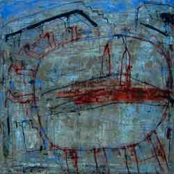 森本秀樹の抽・具象のマット(艶消し)な色彩は過ぎ去りし青春を追慕するのに格好の色使いである。そこからは故郷・宇和島―港町かつ城下町であり、予讃線の終着駅でもあって美しい山河ありというように、いわば歌心をそそるような街でもある―の思い出の風景を背景として、そこでの森本の青春の喜びや哀しみ、苦悩や孤独、そして恋すること等が時の経過というベールを纏っていつも物語られている。どのような青春があったのかは詳らかには知らない。しかし渋く抑えられた色調はその喜びや苦悩を大仰には語らないという森本の性格をよく表わしていると共に、画面に深く静かに歌うような響きを齎(もたら)している―ある懐かしさを伴って。今回出展の「操車場」からは、この思い出の地に佇む森本の様々な懐旧の情が輻輳(ふくそう)して、あたかも木霊してくるかのようだ。森本は「宇和島」を通して、過ぎ去りし「青春」を、そして「日本」を歌おうとしているのである。 (御子柴 大三/アートNPO推進ネットワーク) |