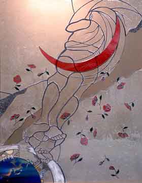 石倉の作品に対峙していつも思うことは、ステンドグラスは色彩あふれる光の窓であり、光を透過した時がもっとも美しいということだ。今回、彼女はボッティチェリの絵画からインスピレーションを得て、バラのモチィーフを作品の随所に配している。また、今回のタイトルから分かるように、大関の作品も全てガラスで作られている。フュージングの厚板色ガラスをカラフルに使ったガラスモザイクで、インダストリアルで人工的な印象を受ける。環境問題もそのテーマにあるようだ。