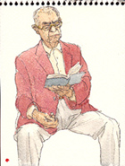 北のつぶやき●画家・装丁家・ライターと多彩な顔を持つ林哲夫さんの淡彩スケッチ。それにしても絵の中の人々は皆一様に読書に没頭しています。思い思いの読書のカタチがあり、眺めていると、私もそこに混ざりたく、仕事の途中で本を手にしてしまうのでした。(北書店・佐藤雄一)