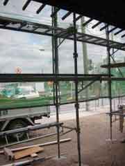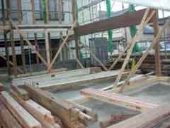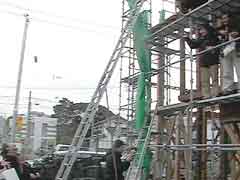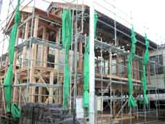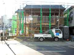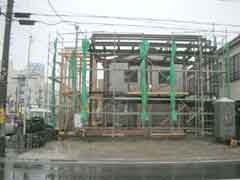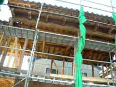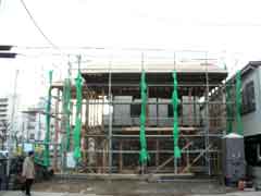 | いよいよ移築先へ資材の搬入となる。基礎が出来上がっての現場の印象は敷地が狭く感じることだった。一番長い材料は5間(約9.1メートル)もあって、建て方作業中の一週間は歩道の専用使用許可と国交省からフェンス内の一部を資材置き場として借りる。前面道路がちょうど水道工事等と重なり各業者がテンヤワンヤの状態となった。そんな中、オバサンたちが「ここが新しい絵屋なのね」などと話しながら通る。なんだか嬉しい気分になった。 |