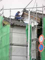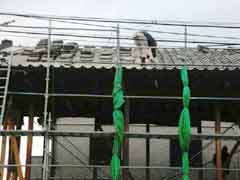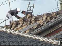 | 屋根瓦を降ろす。再使用のつもりだ。今の新しい瓦は色も均一で寸法もひとまわり小さく、したがって狂いも無く葺きあがりがきれい。しかし、味わいや面白味に欠ける。再使用は瓦葺き職人の腕の見せどころであり、泣かされどころでもある。でも、心配無用。この屋根屋の息子さんは昨年の屋根葺き職人の全国チャンピョンになった人。 |