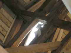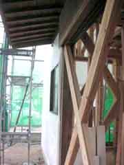| 気づかれた方も多いと思うが、絵屋の特徴的なひとつで「船(せ)がい造り」がある。側柱の上端より外側に腕木を出して化粧板を張ったもの。語源は和船の両舷に渡した棚板(舟棚)を言ったらしく、船頭や名主層以上の住宅にしか許されなかったと建築大辞典に書いてある。構造的にはとてもバランスが悪く、特に絵屋の場合は道路側と反対側とで屋根の長さが違うことや開口部が大きくて壁面積が少なく、よくもこれまでの地震に耐えてきたものだと感心してしまう。しかし、ご心配なく。移築先の絵屋は目立たないところには近代的な金具なども充分に使って地震対策も講じてある。 |