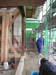 正直なところ、最初から見積りには自信が無かった。仕方ない、一般住宅並みの見積書をつくったが、見えないところが余りにも多すぎた。「まあ、なんとかなるだろう」「やらねばなるまい」の心境だった。6年前の開廊時とは違ってそれぞれの気心も少しはわかったつもりではいたが、代表の大倉さんも建築家の純一さんもいざとなるとなかなか「イチガイコキ」で我が侭である。それでもご本人たちはまだまだ控えめのつもりでいるようだ。まあ、結構私も現場では変更を出して職人に喜ばれてはいないのだが、レベルが違うと大工に言われた。どうであれ、長い時を積み重ねた建築物の包容力は凄いと思う。われわれ如きのナンダカンダは小手先の事柄に過ぎないのだろう。酸いも甘いも噛み分けてきた長老のような絵屋の建物は心豊かに何でも受け入れてくれたような気がする。