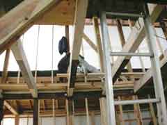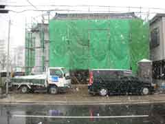 | 今日からクレー車で建て方をはじめると言うのに大雪注意報が出る凄い天気となった。いくら材料をブラシで洗ったとは言え、梁の上などは滑るので油断できない。それでも職人たちの頑張りもあってなんとか大きな骨組みを上げ終えてホッとする。 |
