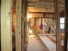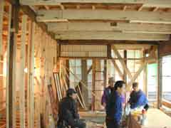 | 応援組の二人からは二階を集中的にやってもらっている。当初、予算のこともあり二階は新建材も使ってコストを抑えようと建築家の純一さんとも話していた。が、いざ現場に立つと新建材などとても使えない雰囲気なのだ。妙案として、当社の工場にある杉の縁甲板や下見板の在庫を新建材並みの価格で流用したのだがどこも足りなかったのである。お陰で見学に来る皆さんには「二階のほうが良くなったじゃない」と褒められたりして評判は良かった。 |