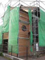 | 今日で外部の杉下見板を張り終える。増築部は横張りであえて木地のままとし、塗装は施さなかった。既存部は縦張りとし、時間の積み重ねを経たように色をつける。実は上棟後に展示スペースの柱も3本古材に取り替えた。正直な所私は塗装すればいいと思っていたのだが、設計者の(伊藤)純一さんのこだわりである。これがなかなか無くて焦った。3寸5分(約10センチ)の細い柱であったり、せいぜい30年ものだったりで、思うようなものが見つからない。それが偶然通りかかった隣町の建築仲間の薪ストーブ用の山に何と180年も前(文政年間と書いてあった)の土蔵の柱が残っていたのである。「どうせ、もう燃すところだったから」とお酒2升で譲ってもらった。なんともラッキーな話だ。純一さんのこだわりに軍配。 |