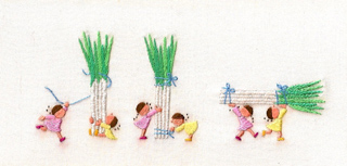 また刺繍糸という制約のある素材を用いながら、野菜の葉の緑の繊細な質感、梅干しの表面のしわの微妙な色合いの濃淡などを、色彩鮮やかに豊かに描く表現力に感嘆する。