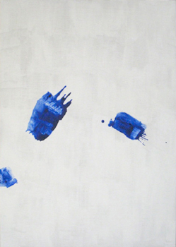 白く塗られたパネルには、点とも短い線とも見てとれる鮮やかな青い「跡」が描かれている。「跡」の表面には刷毛目が残る。