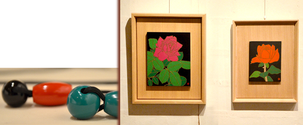 作品は菖蒲やバラなど身近な花々などをモチーフにして、黒漆塗りの板に平蒔絵を描き、彩漆で彩色する手法で作られている。約30点の作品の中でも「古代彷彿・群鹿U」=写真=は古代の文様に着想を得て、鹿の群れを色鮮やかに描いて躍動感がある。彩漆の鮮やかな発色は、長年の研究に基づく、温湿度と乾燥時間の微妙な加減により生み出された。