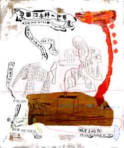 素描の名コレクションで知られる相澤美術館で、黒田征太郎の大きな新作27点を並べる充実した展覧会が開催中だ。目の粗いキャンバスに、白い絵の具をなすりつけ、白い紙をはり、鉛筆で、ペンで、絵の具で、線を、文字を、イメージを描く。その描くということの素(す)の息づかいがとても、いい。海風に揺れる葉桜がガラス越しに見えるロビーの冒頭の壁におかれた2つの絵には、分厚く塗られた絵の具をこそげるように、OKINAWA 2001 8・15と書かれている。その場所、日付にジーンときている、そのジーンだけがどこまでも響いている絵。