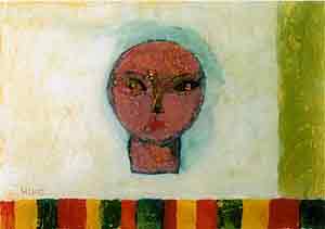 画面はサムホール、あるいはそれ以下。ガラスに描くという技法上、今まで氏が描いてきたタブローに比べても格段に小さい。モチーフは今までも氏の作品に取り上げられてきた卵や球体、ホオズキなど決して目新しいものではない。