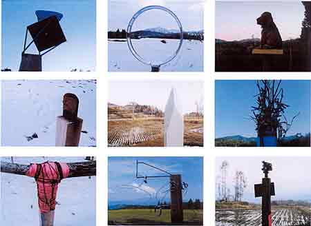 本展は栃尾市軽井沢で、昨年9月から今春まで開かれている、延べ211日間の野外アート展「Nのための食卓・展」を、移り変わる季節とともに記録したものである。「N」は、自然のことである。通常では、案内状でより多くの人に足を運んでいただくのであるが、今回は、「自然」相手に秀峰守門岳に作品を並べたという一風変わった野外展なのである。以後、人々に知れることなく2メートル余りの9本の杭上に、一見お供え物のように9つのアートが置かれた。