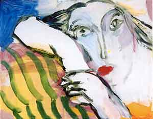 新作の中の女の人たちは、前にも増して艶やかで、チャーミング。大胆な筆遣いなのだが繊細さを感じる。絵の中に爽やかな風が通っているようだ。モデルはいないとはいっても、生徒さんたちとの楽しそうな交流などから、生き生きとした表情が引き出されているのだろうか。共通する表情には、作者の心のうち深く住む、永遠の女性が映っているようでもある。一途に描いてきた人の自信と不安が垣間見える。