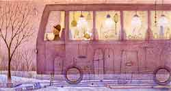 猫の爪のような細い月がかかる時計台。夏の終わりに、夕焼けの中で小枝のタクトを振る子供。ぶどう色のたそがれ時を行くバス。キリンのもくばや玩具の列車、雪原に降る光のような雨…。細い筆で毛筋のように色を重ねる近藤の絵は、どれも透明感があってシンと静かだ。CDケースを2つ並べたくらいの小さな画面なのに、じっと見ているうちに画面の深い奥から音楽が聞こえてくる。