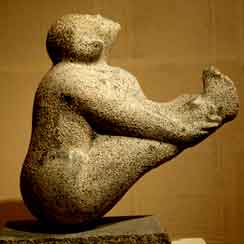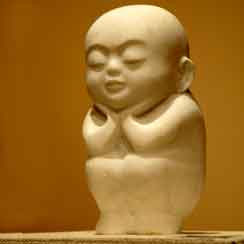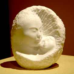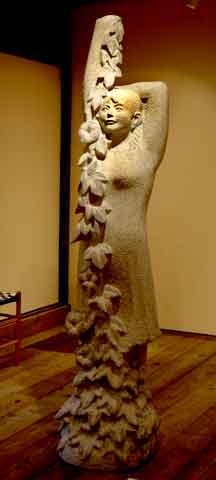 足元にまとわりつく朝顔の蔓をつかんで、すっくと立つ少女の像。清楚な顔や肢体には、現実のモデルの介在を感じさせない、美しい仏像に近い感じがある。それでいてみずみずしい血がかようよう。朝顔と少女の組み合わせも意表をつくようで、何ともいえず自然。朝顔の花や複雑な葉群を、見事に掘り出す技は年季の入った職人のそれだけど、巧みさが自己主張しすぎてはいない。