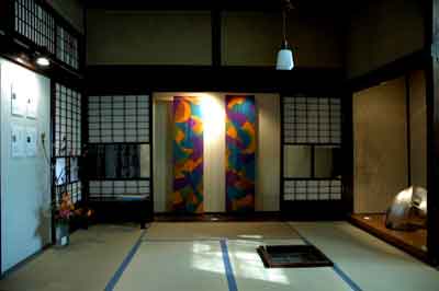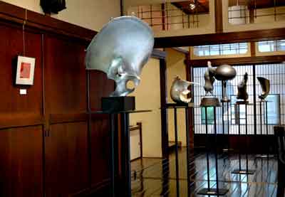 画廊中央、板の間にほぼ一列に6体の金属彫刻(大桃洋三、西片亮太、渡辺和也)が並び、反対側の障子戸の内側にわずかな空間をとって、捺染技法による細長い布作品(月永理見)が吊り下げられる。金属作品をのせている背の高い台座も渡辺によるもので、これも金属製。古い日本家屋のなかに金属という組み合わせが新鮮に見えた。