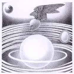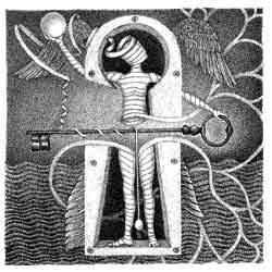 阿部展也の絵と同じように、瀧口の詩の言葉を、彼女もそのままなぞることはしない。女囚の手袋、赤い唇、鍵穴と痩せた女、コップ、鳥といった詩のイメージは、それでも思いがけない変容を経て、版画の夜の水底に明滅し、天空に揺曳する。とはいえ詩は版画の起点、グメルスが自らのイメージをそこからつむぎ出すための、ただの手がかりだったわけではない。
